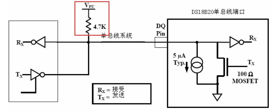 图里说明, DS18B20 在输出时,是靠拉低 DQ 通信线实现低电平输出,靠释放 DQ 通信线(被上拉电阻拉高)来实现高电平输出