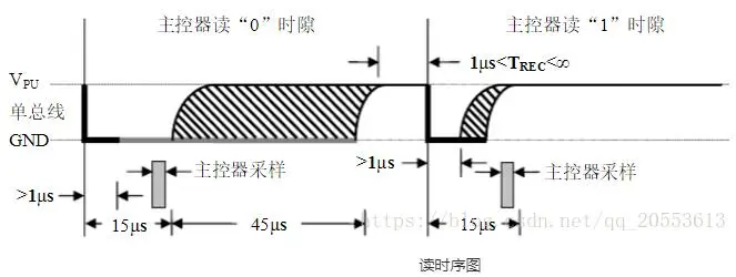 主机把总线拉低至少 1us (读时序开始),在总线控制器发出读时序后, DS18B20 通过拉高或拉低总线上来传输 1 或 0,当传输逻辑 0 结束后,总线将被释放,通过上拉电阻回到上升沿状态,从 DS18B20 输出的数据在读时序的下降沿出现后 15us 内有效,必须在 15us 内读取数据,传输完一位后要等待至少65us(因为低电平它持续时间是60us)