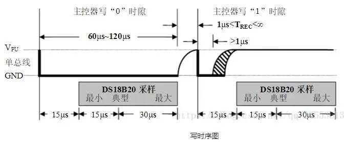 写时序分为写 1 时序和写 0 时序,总线控制器通过写 1 时序写逻辑 1 到 DS18B20,写 0时序写逻辑 0 到 DS18B20,所有写时序必须最少持续 60us,包括两个写周期之间至少 1us 的恢复时间。当总线控制器把数据线从高电平拉到低电平的时候,写时序开始