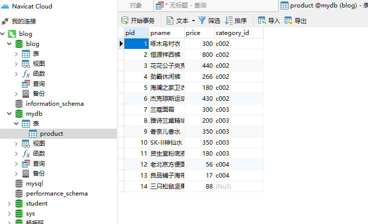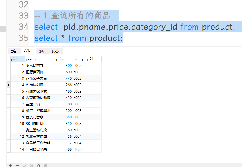 select pid,pname,price,category_id from product; -- 这个方法慢,如果有几十列那么...