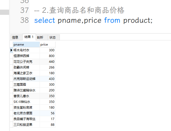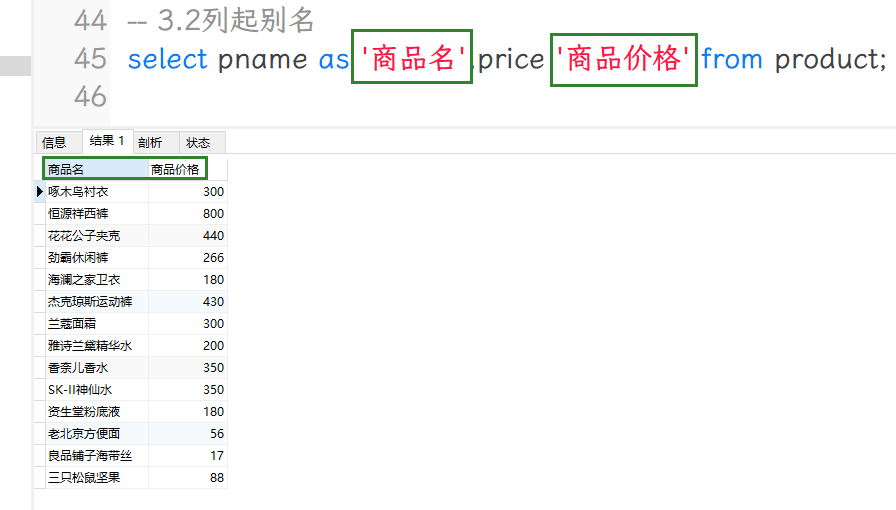 select pname as '商品名',price '商品价格' from product;
