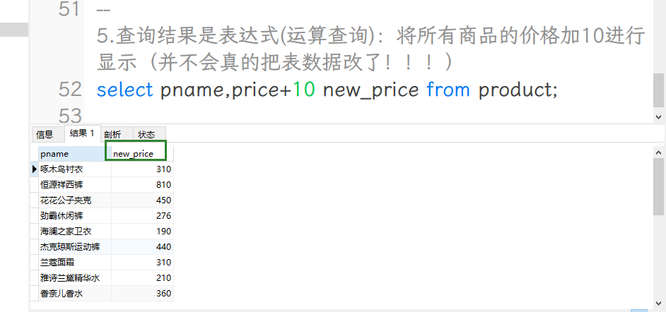 select pname,price+10 new_price from product; -- new_price 是列的别名(不可能拿price+10当列名吧)