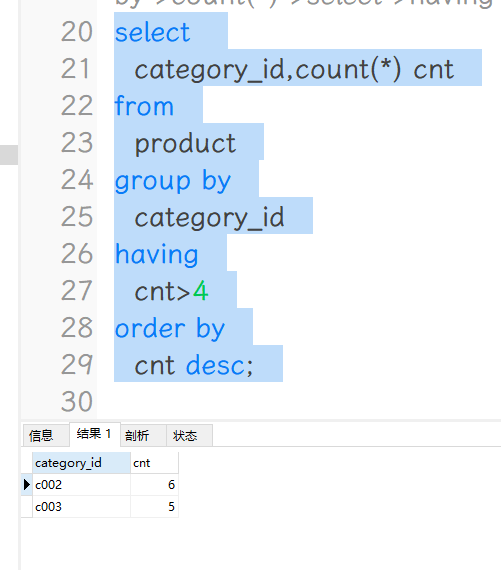 -- SQL执行顺序:from->group by->count(*)->select->having->order by