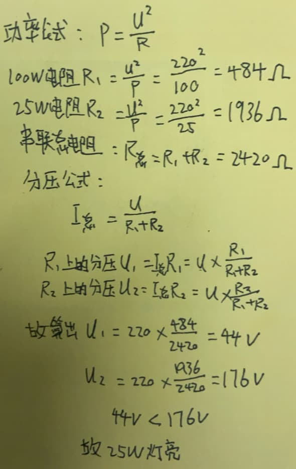 25W的灯泡比较亮(同一额定电压并且串联时,功率小的比大的亮)