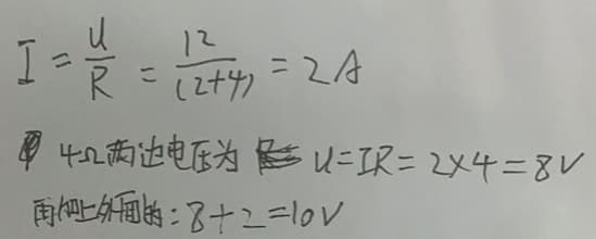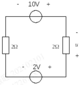 -4V(首先假设10V为参考方向顺时针绕行一圈,假设回路电流为i,列出公式 10+u-2-2i=0,计算电流为(10-2)/4=2A,代入即可得出等于-4)
