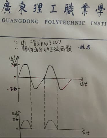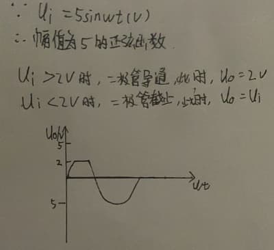 答:ui=8sinωt(v)是一个幅值为8的正弦函数,经过二极管后,由于二极管的单项导电性所以只有正电压可以通过(理想情况下忽略了正向导通电压)