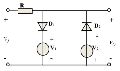 - 二极管构成的限幅电路如下,设二级管的导通压降为VD,图中两个直流电压源的大小分别为V1,V2,画出输出电压Vo随输入电压Vi的变化曲线。