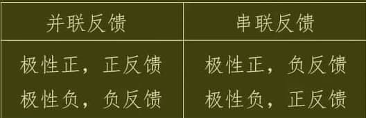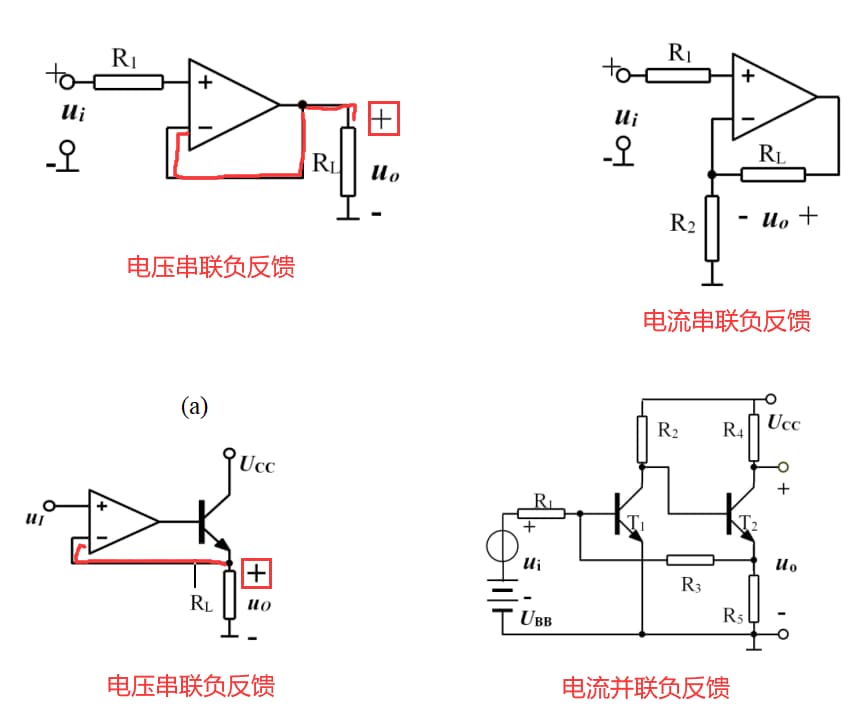 判断反馈通路与 Uo或Uo的“+”之间是否只有导线,是则 电压反馈,否则是 电流反馈;根据反馈通路与最左边元件输入端交点是否与输入信号Ui同一边,是则 并联,否则 串联;